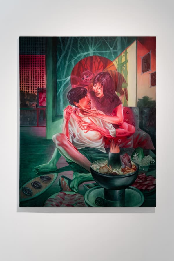 In this series of works, Tan confesses a fascination between escapism and reality. The contrast between the two themes creates a dynamic tension within the series, inviting viewers to contemplate the interplay between fantasy and the tangible world. He layers these thoughts unabashedly through his reimagined landscapes and draws inspiration from the seemingly quiet and mundane. Emphasising a spotlight on routine activities, Tan’s characters are set against familiar local backdrops. In works such as Heat (2023), we observe the juxtaposition of the typically joyful activity of mahjong transformed into what feels like an apocalyptic scene. By using hues of red and green in his paintings, Tan evokes an unsettling atmosphere, intending to encapsulate the everyday instances of isolation and uncertainty taking hold of a moment. Often using characters and alter-egos that recur in his paintings, Tan blends the politics of selfhood and identity with the deeply personal inner lives of individuals.