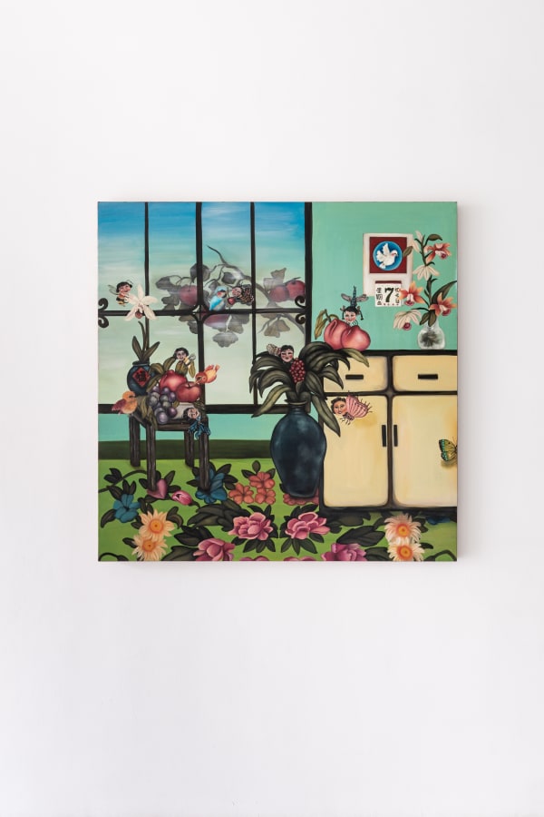 Reminiscing on her childhood, Sanctuary (2022) is symbolic of Koh’s memory of growing up in an Asian household. With the depiction of plumped fruits and oriental decorative flowers complemented by an old-school charm, this painting is representative of Koh’s dual heritage being Chinese and Peranakan. Playing on the traditional saying that a woman’s place is at home or in the kitchen, Koh overturns that belief and instead illustrates how women are the heart and soul of every household.