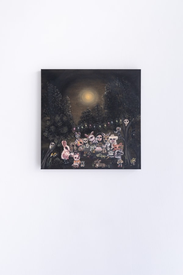 Stepping into the serene landscape of Fantasyland (2022), Koh sets animals as her subjects. This painting is an idealized portrayal of her curiosity about what people regard as fantasy and their tactile fetishes. What seemingly looks like a page out of a children’s storybook, upon closer look, the scattered animals in the garden bear humanly body features wearing intimate sensual paraphernalia. Much like how humour is used to deflect trauma, Koh confronts her fear of physical intimacy through bizarre yet witty depictions of animals as humans.