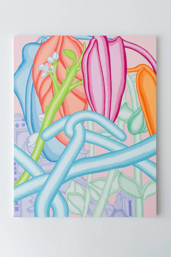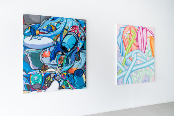 Much like the works of Davaine, Julien des Monstiers’ (b. 1983, Limoges) approach does not stray from his signature style of foregrounding floral motifs. Similar to his previous show, Flowa Powa, we witness the continuation of the articulation of colours and textures that achieve depth within each piece. In this show, Monstiers presents three new works borrowing a multitude of aesthetic principles including collage and montage challenging the conventions surrounding a painting.