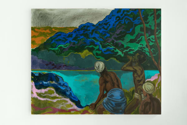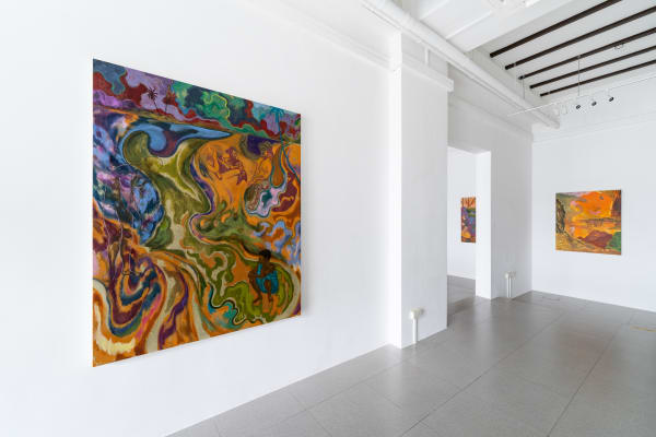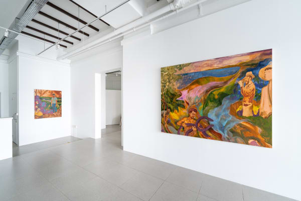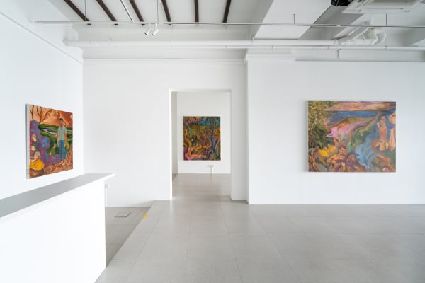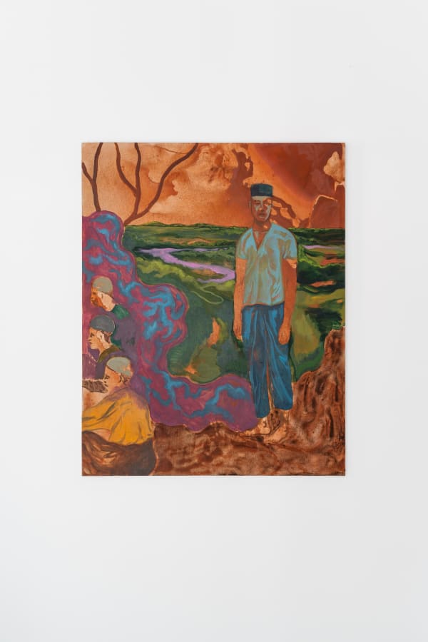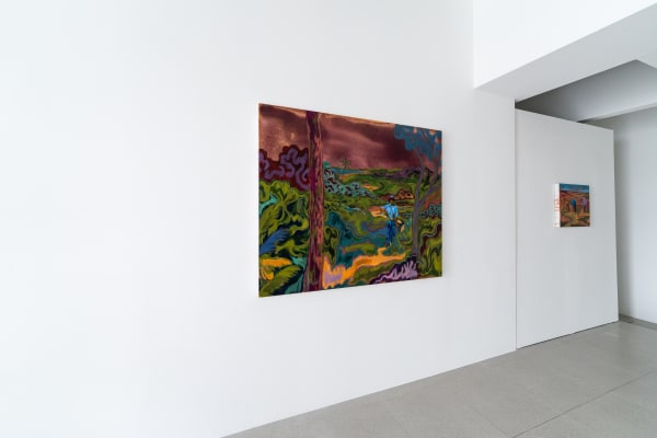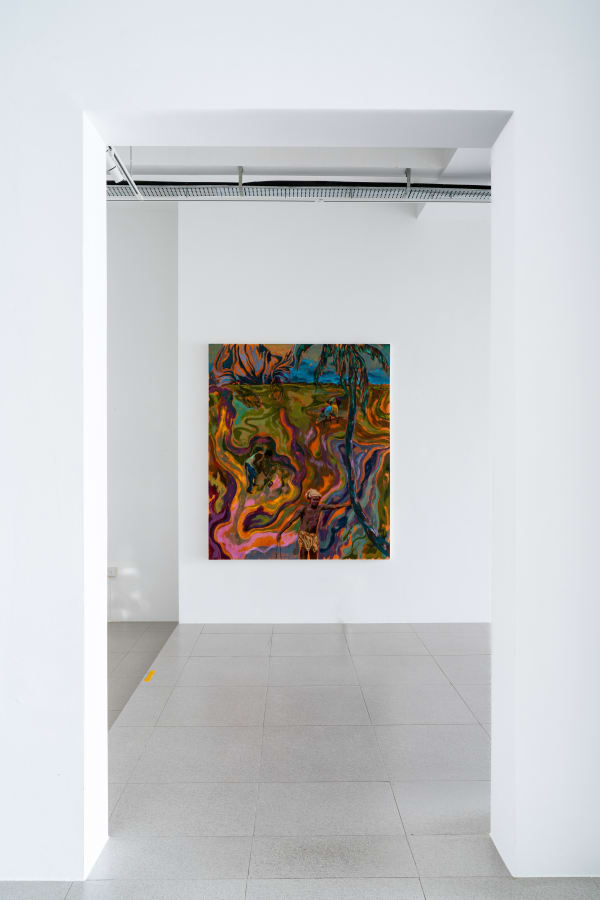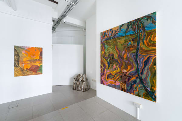 Another longstanding interest in Wahab’s practice is the relationship between the form of representation and what is being represented. In Shape of Land, the representation of the landscape is a prominent feature of his paintings. Wahab regards the colonial landscape representations that he references not only as a view or a represented space but also as text.