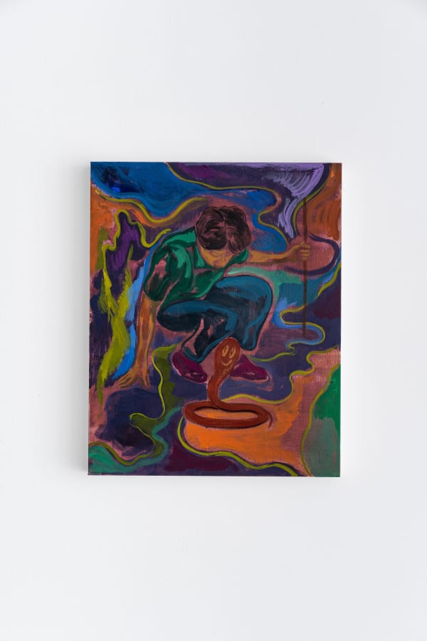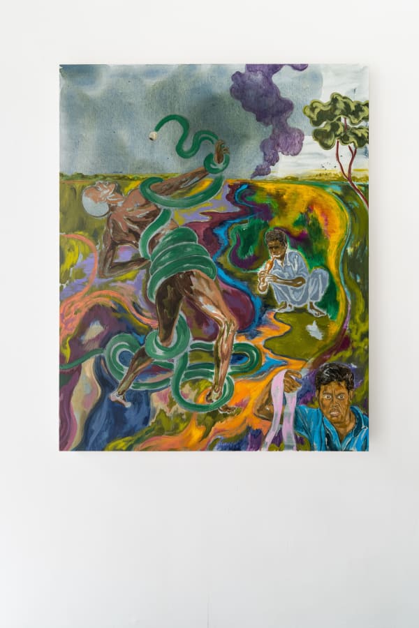 One theme that informs his latest works is the colonial use of geography to accumulate information, wealth and power. In this context, colonial cartography was a visual language and technique imposed on foreign lands to articulate imperial space and communicate specific interests, doctrines, and worldviews. In his painting titled Serpentine Prison (2022), Wahab has inserted several visual cues related to narratives surrounding surveying and mapping.