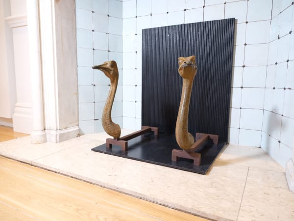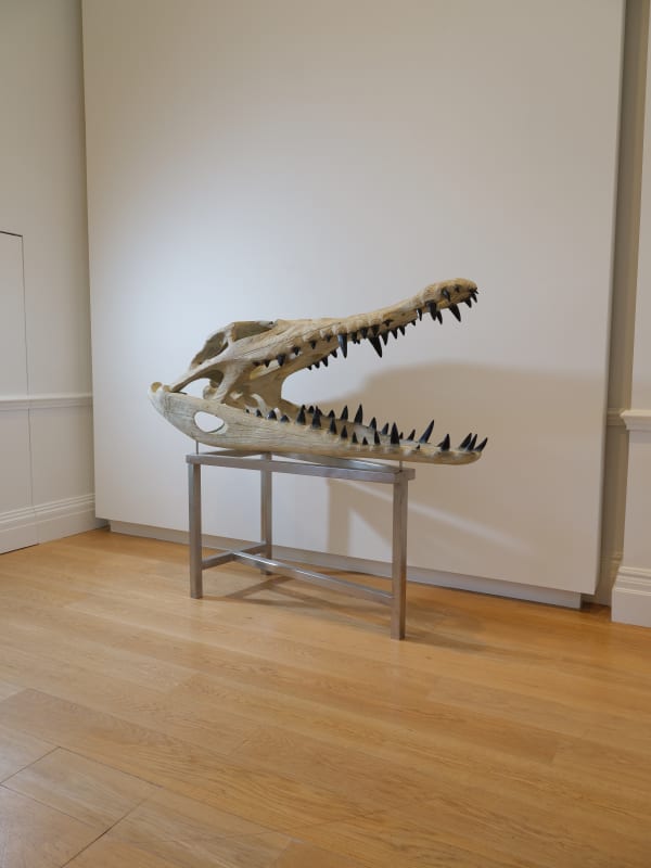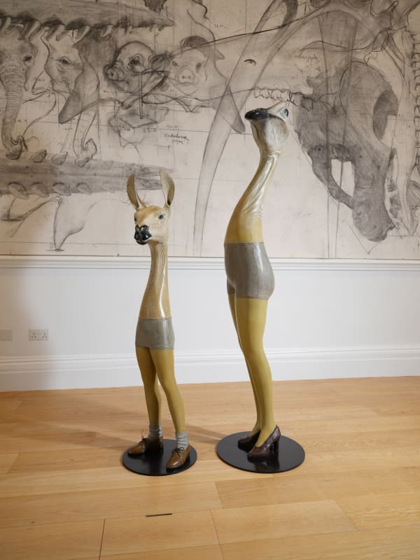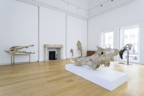 While communicating the power differential between humans and animals, Garel’s work showcases a perfect harmony between abnormality and execution. Dramatic choices in scale, from an astounding three-meter-long warthog skull - Phacochère (2023) to an exaggerated pink flamingo skull - Phoenicopterus I (2013), are made with careful precision to create convincing sculptures of palaeontology and taxidermy. Within the backdrop of these sculptures are Garel’s elaborate charcoal sketches, Palimpsest, which grant a glimpse into the preliminary visions of his oeuvre.
