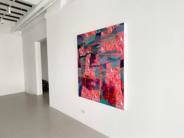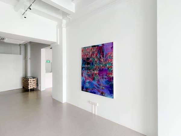 For Flowa Powa, des Monstiers’ spirited treatment of painting centers on the floral motif depicted in a lush state of abundance. Here, beauty and chaos appear to exist in tension as motifs of florets are repeatedly imprinted across the canvases. Nonetheless, the artist’s careful intermesh of exuberant colours maintains a delicate sense of order amidst the variegated frenzied strokes and patches of paint in and around the floral patterns.