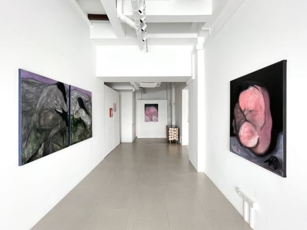 A poignant painting by Bendini hanging in the center of the first gallery, Pillow Talk / It Is Safe to Look Within, 2021, exemplifies the emotional depth in her most recent series of paintings. The dreamlike scenario pictures a seated female figure intertwined with a second undefined protagonist, who are flanked by two cosmic cats that appear to be very comfortable in their surroundings. The dominant red and black tones of the paint elicit a visceral intensity that can be uncomfortable. However it proves to be rewarding for those willing to enter into this private space. The emotional depth of her practice separates Bendini from her more obtuse contemporary peers and the beauty of her oeuvre exists in the spaces between fantasy and reality, mystery and definition. The approach she takes to painting is an act of invitation to consider the meandering path to wholeness and presence.