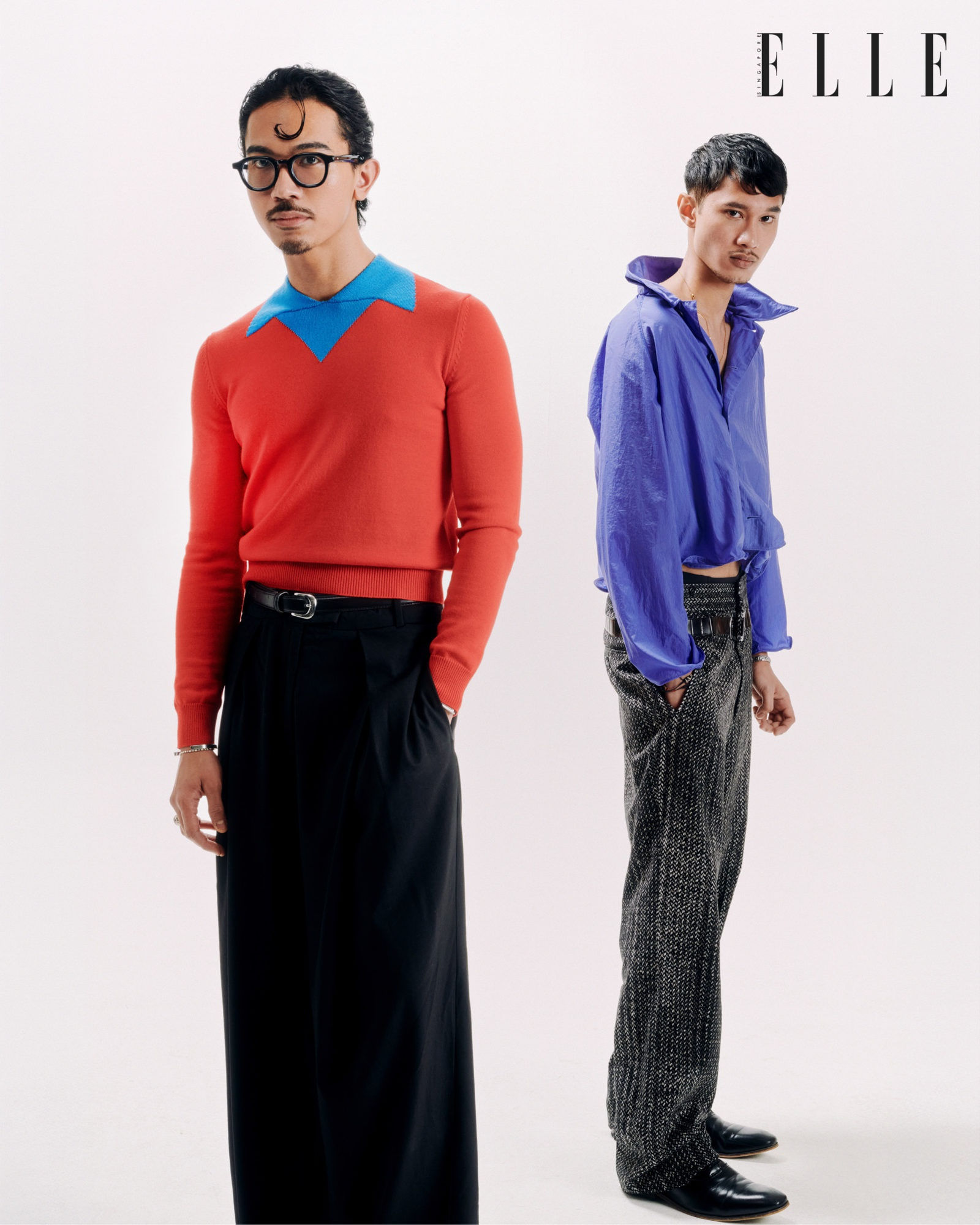 (From left) On Alif: Sweater, PRADA. All other clothing and accessories, Alif’s own. On Israfil: Shirt; trousers, PRADA. All other clothing and accessories, Israfil’s own. Photo credits: ELLE Singapore.